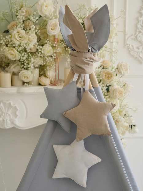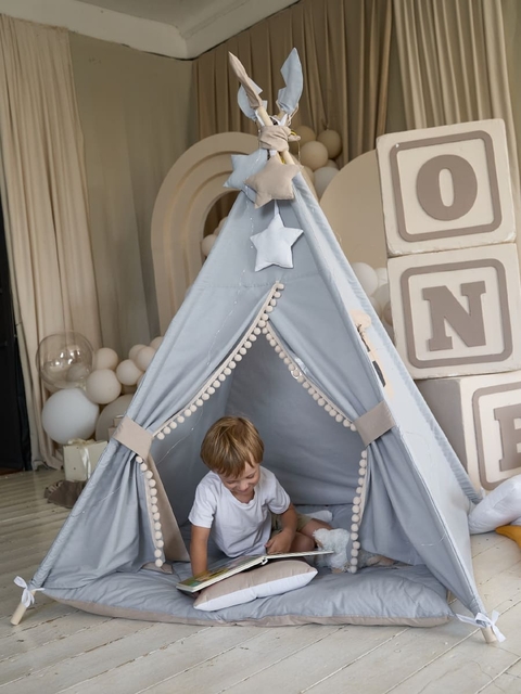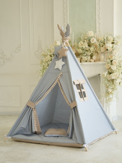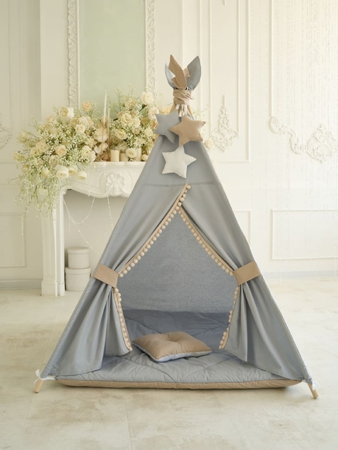 • Палитра: воздушная (светло-серый, бежевый) • Настроение: умиротворение и нежные грёзы • Материал: натуральный хлопок • Каркас: лёгкое и прочное дерево • Ткань: натуральный дышащий хлопок, нежный на ощупь • Для кого: для маленьких мечтателей, ценящих уют и спокойные игры • Большой размер: [115 см х115 см х160 см] – подойдет для игры нескольких деток одновременно